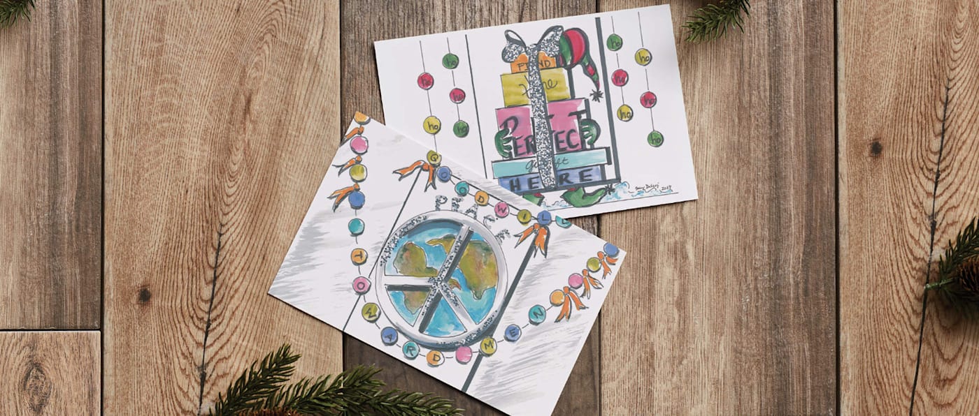 The colour palette is sophisticated: soft citron green, with pops of red in the words “merry” and “bright”. The glittered accents on the coasters add sparkle to draw people in. Our element of surprise is that the two wreaths are actually forming sunglasses! Statement to the otherwise simple, smaller scaled words.