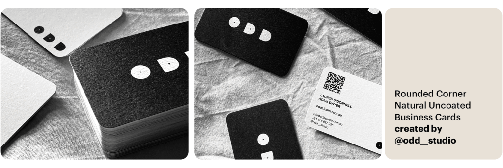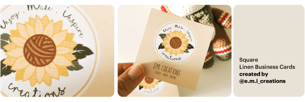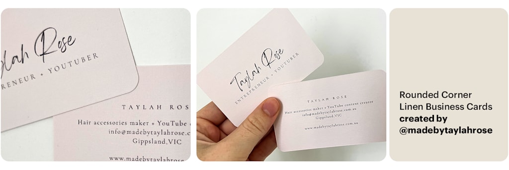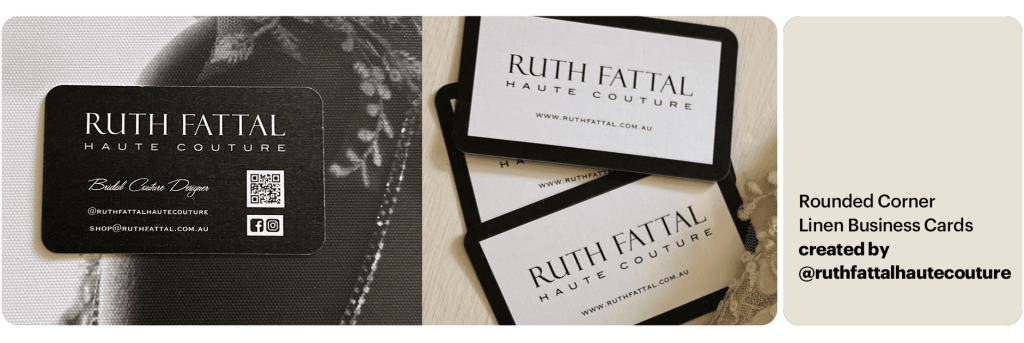 “I saw a linen business card at an event and was inspired by that! I love the simplistic look, rounded edges and texture. I created my own and feel proud to hand my card out at events.”