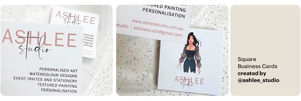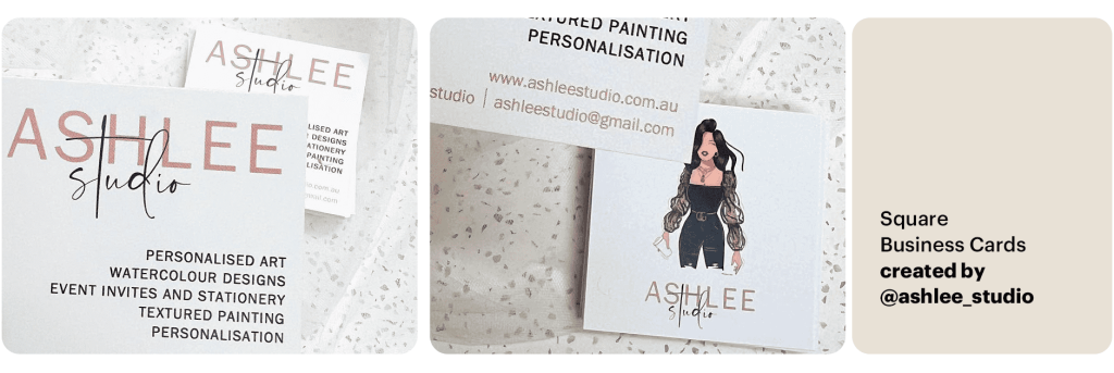 “I decided to keep the design of my cards simple and to showcase my business logo, keeping the colour palette consistent with it. The card contains the basic information of my business; email, website and Instagram.”