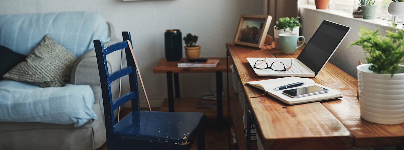 When setting up your workspace, try to think about your needs. It’s great to have the option of working from the sofa, but if you need access to your phone, computer and a notebook, it’s much better to have a surface or table to work at. This will help keep you organised and get you into the right headspace for working.