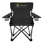 Enjoy outdoor adventures and get your brand seen with this sturdy folding chair featuring comfortable arm rests and convenient beverage holders. Crafted from durable polyester with a strong steel frame for reliable support.