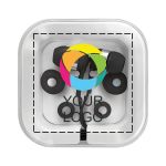 Premium set of earbuds which are presented in a smart carry case with a choice of three different bud sizes to ensure a comfortable fit. Branding is on the carry case.