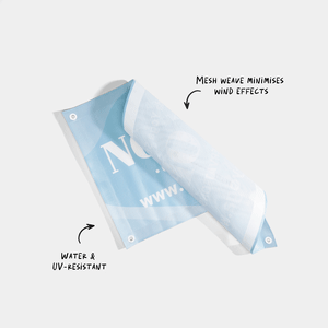 We use PVC-coated 270 gsm polyester thread to create a 70-30 mesh weave. This means that 70% of the banner is made of solid material, while the remaining 30% is made up of small holes that let the wind pass through.